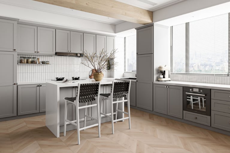Let GHI Stone Harbor Gray bring your kitchen the relaxing feeling of a foggy day. Clean shaker doors and a light gray paint color create a subtle calm. Contrast with bright colors to form a bold modern combination, or keep the zen feelings with muted tones. This timeless style and fresh color are backed up by soft closing hinges and drawer slides.