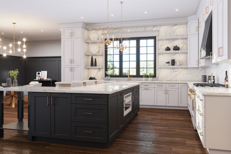 US Cabinet Depot Shaker Black is a clean-painted style featuring shaker doors and a neutral black color. The design possibilities are endless, check out our "Gallery" tab for some inspiration. US Cabinet Depot Shaker Black makes the perfect pairing for a contrasting color island. Build the black kitchen cabinets of your dreams, or pair with natural colors for a cottage core vibe. Please Note: The bottom doors of utility cabinets feature a horizontal border in the center.